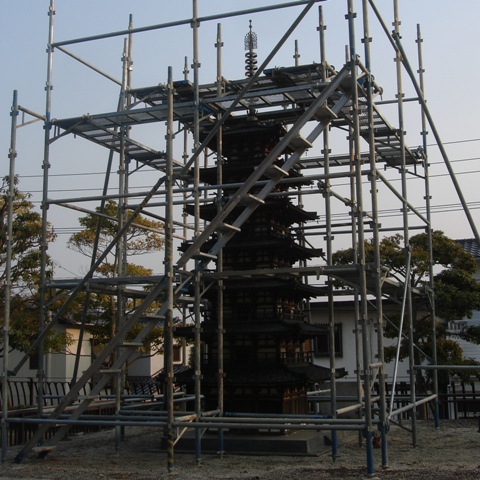 近所にある「五重塔」の改修?が行われるらしく、足場が設置されていました。