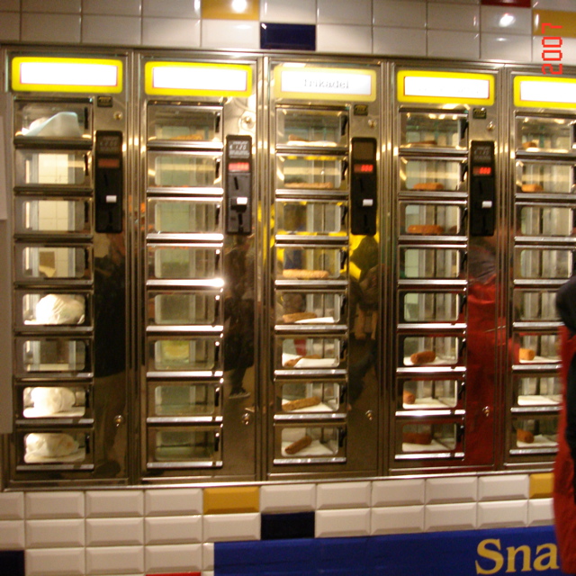 そんな中、自動販売機を発見!ガラスボックスにホットドッグなどが入って売られてました。