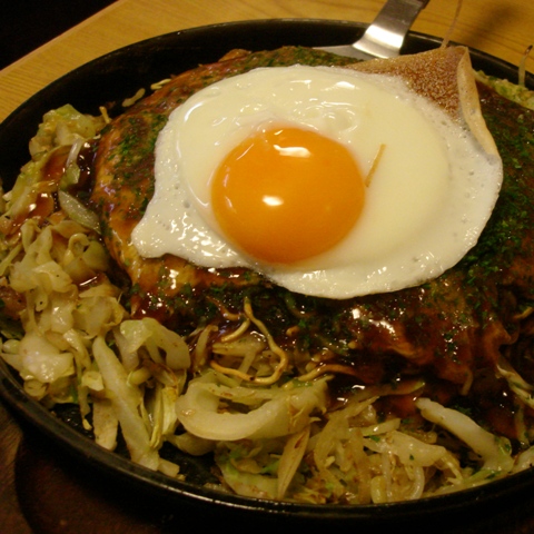 天神にある広島風お好み焼屋の「月見肉玉そば」