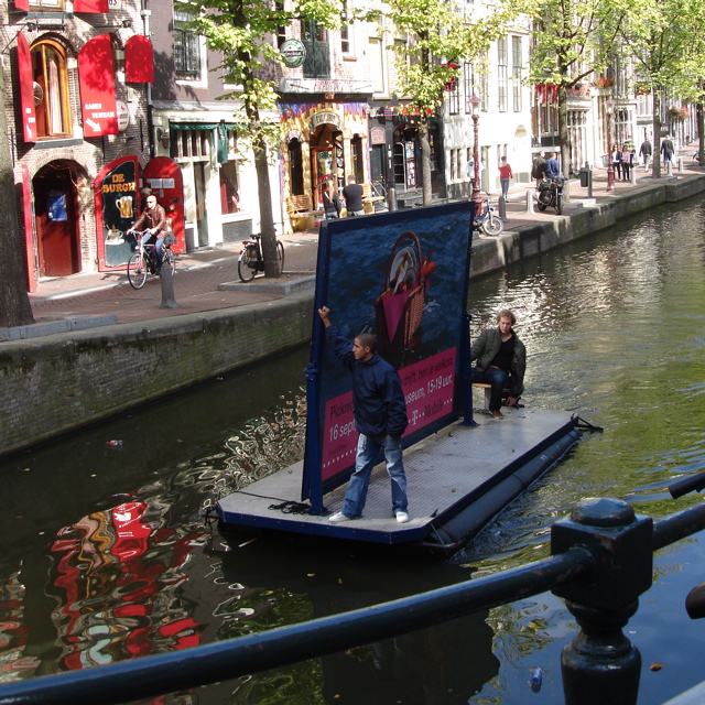 これだけ運河が多いと、広告塔もボートが利用されていました(右写真)