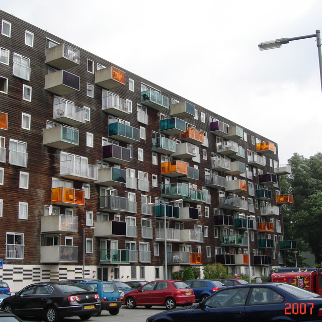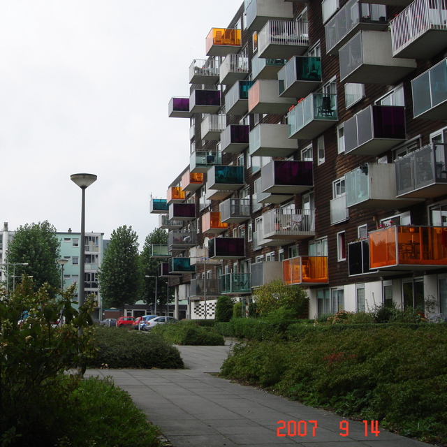 右の写真が今回探訪した集合住宅です。派手な外観です!