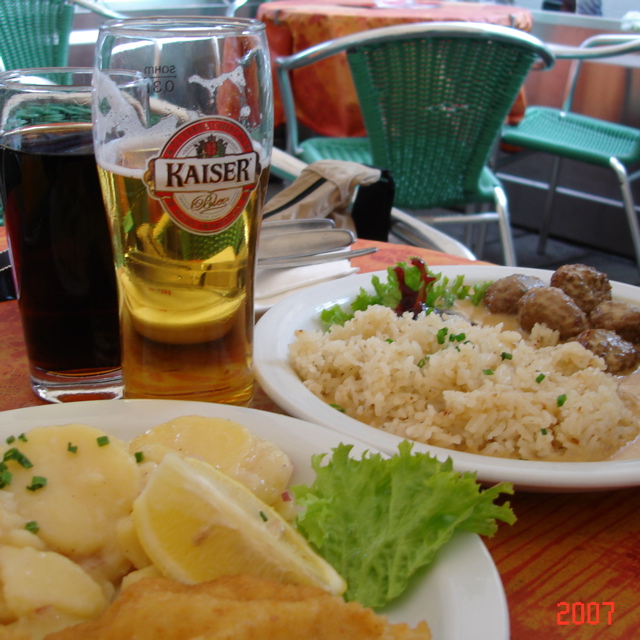 ヴィナー・シュニツェル(子牛のカツレツ)+ビール、ミートボール+コーラを注文
