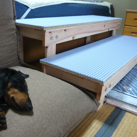 BEDの横に2つ並べて、脚を切って階段にしました。