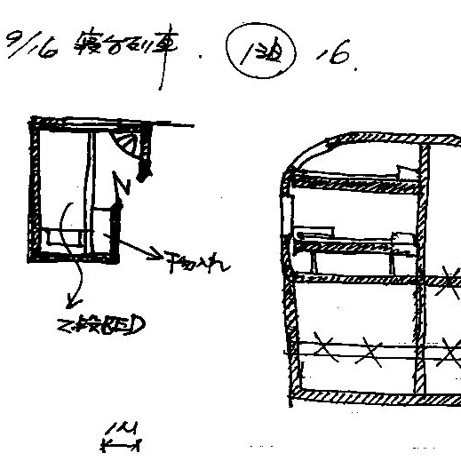 中央のスケッチが、乗車した車両の様子で、右がそのベッドの写真です。