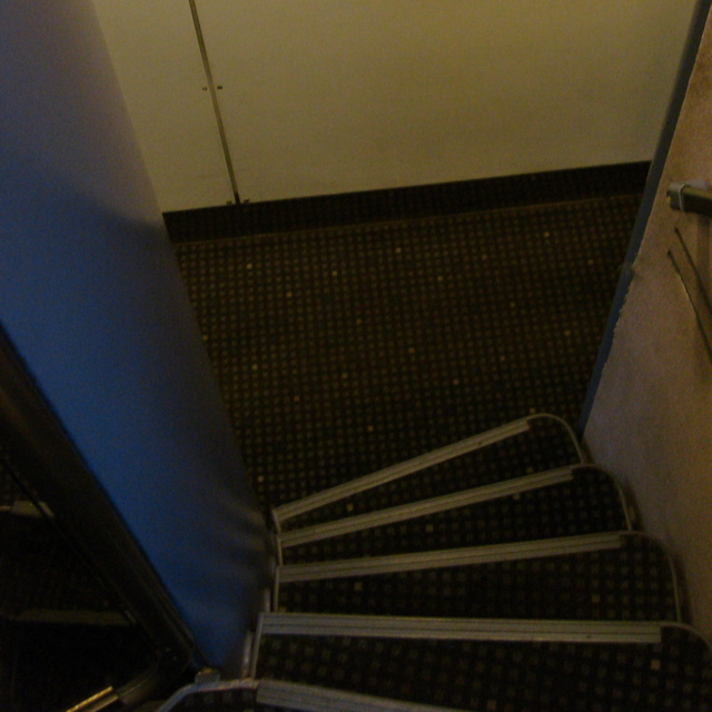中央の写真が、通路の様子で、右写真が、下から部屋を眺めた感じです。