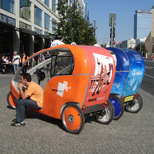 (左)日本でも見かけるようになった自転車タクシー!