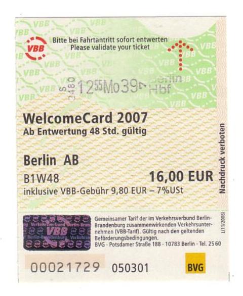 乗車券はゾーン制、1日乗車券などもあるのですが、noridoriは「ベルリン・ウエルカムカード」を購入。