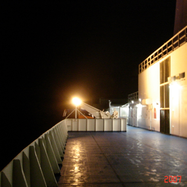 そこは、さらっと抜けて、デッキへ向かうと、真っ暗な海が広がっていました。
