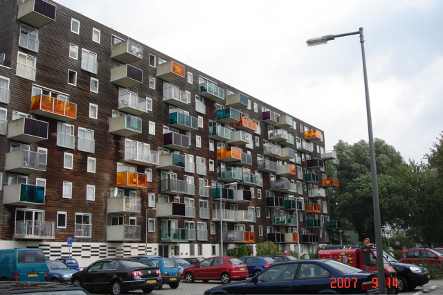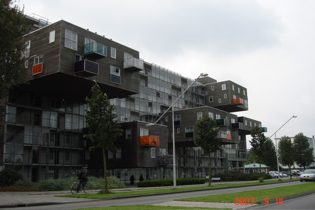 南面はカラフルなバルコニーで驚き、北側では住戸の飛び出しぶりに驚きです。