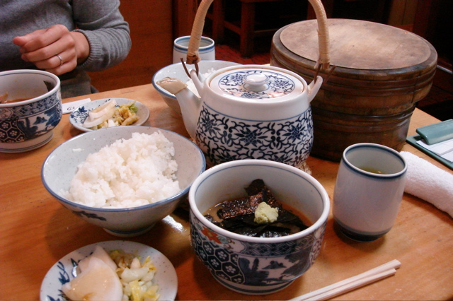 ”おひつ”に入った白いご飯たっぷりとお茶がたっぷり入った急須が運ばれてきます。