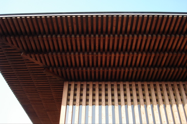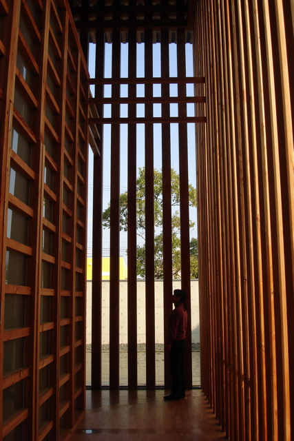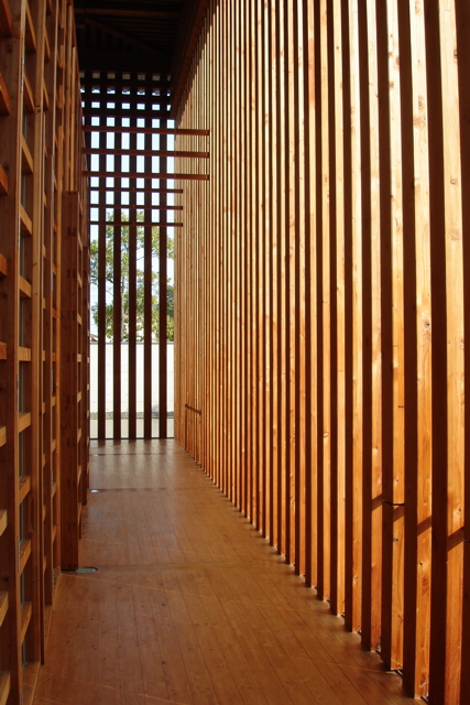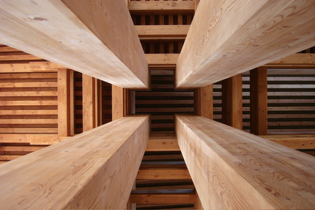 内部では、等間隔に並ぶ集成材の木立から光が飛び込んできます。