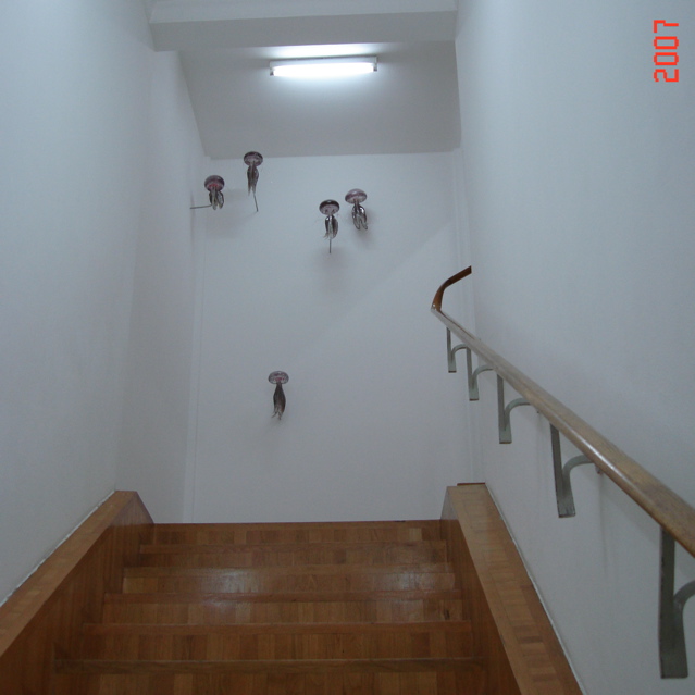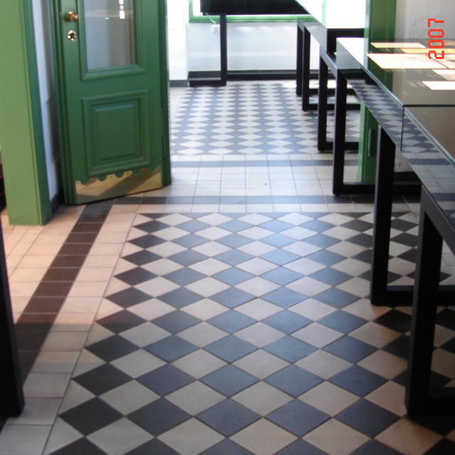 内部は、デザイン貼りされた床材を眺めながら、作品の展示を見ていきました。
