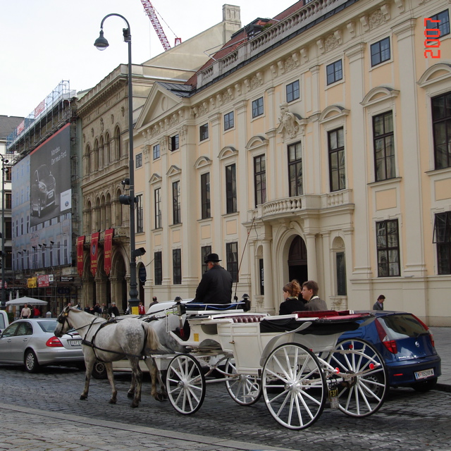 街中では、馬車が行き交っており、街並に歴史的な彩りを添えています。