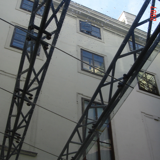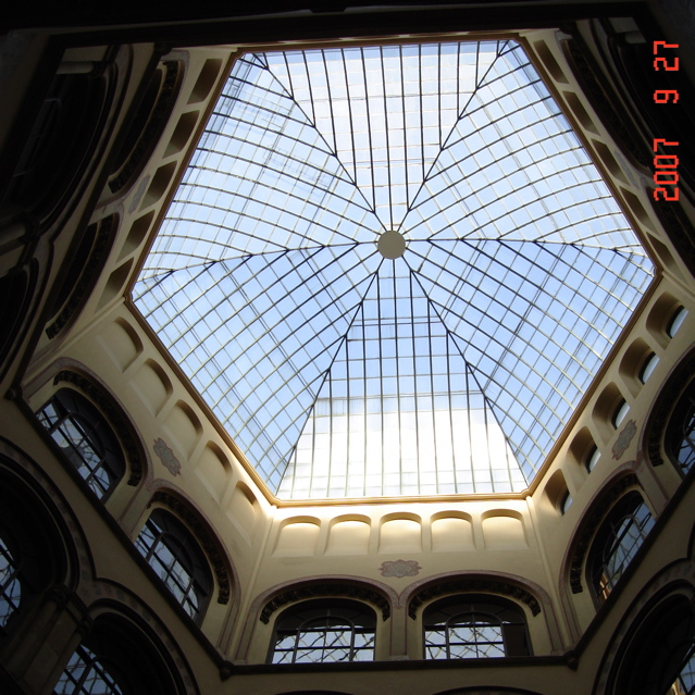 アトリウムを下から覗き込むと六角形の奇麗な天窓が見えます。
