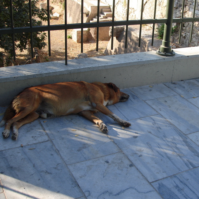 アテネの暑さに多少ばて気味の犬と、道に佇むねこ。
